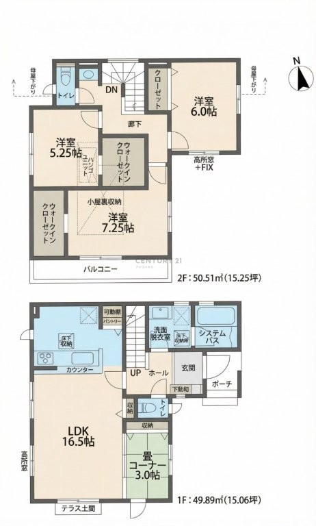 建物は2階建て・3LDK+畳コーナー、LDKは16.5帖の広さを誇り、ご家族が自然と集まる憩いの空間に。