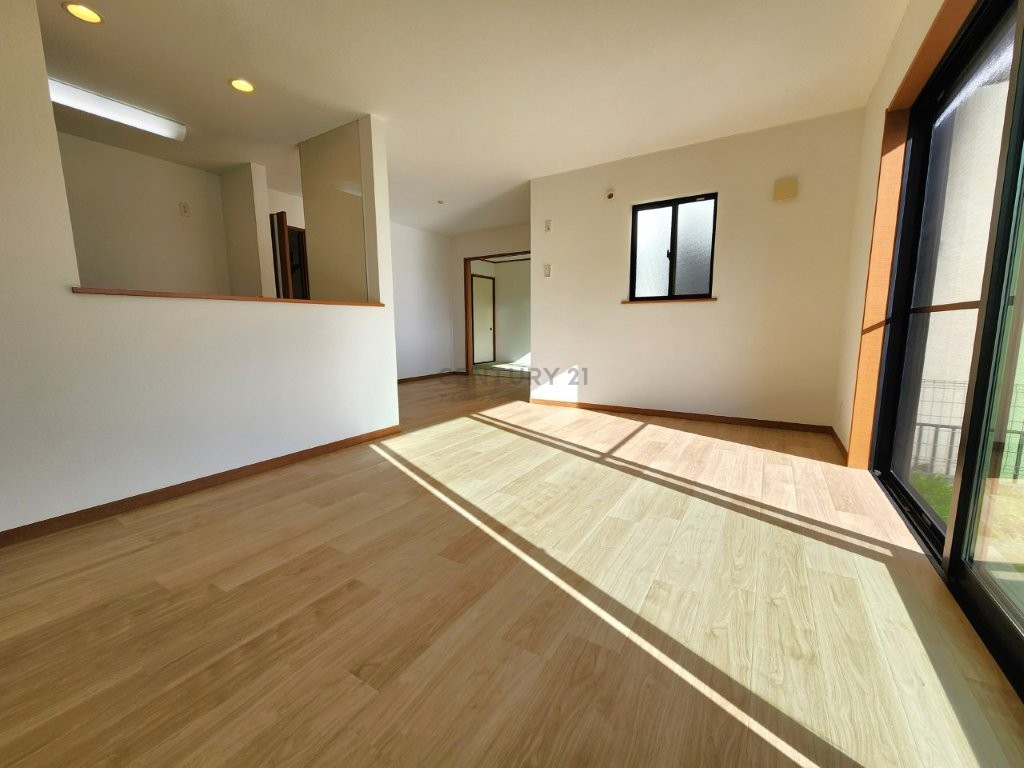リビングは広々18帖。床暖房完備で冬も暖かく、南窓から庭を望む寛ぎの空間です。