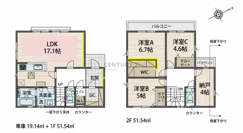 ビルトインガレージ(車庫19.14㎡)付きプラン。雨の日も濡れずに乗り降りでき、大切なお車を守ります。ウォークインクローゼット(WIC)とシューズインクローゼット(SIC)を備え、収納力は群を抜いた充実の仕様。LDK17.1帖のゆとりあるリビングに加え、納戸4帖・バルコニーも完備。全棟最大の延床面積122.22㎡で、広々とした暮らしをご提案します。